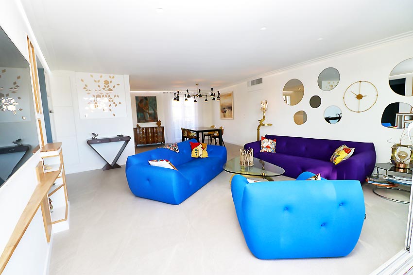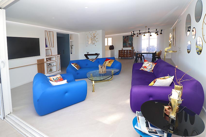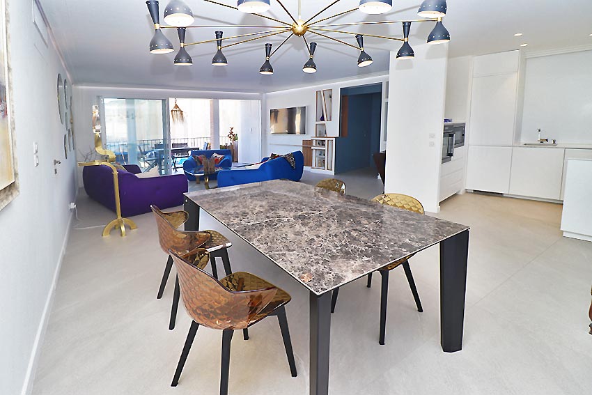 - un grand séjour avec espace salon et espace salle à manger, ouvrant sur une loggia ouverte avec une belle vue sur les canaux